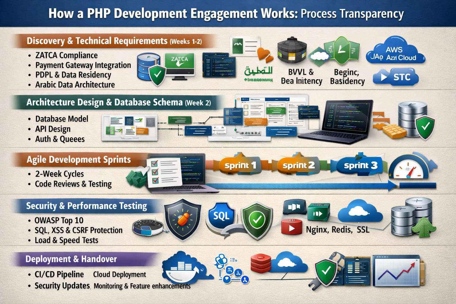 PHP development engagements begin with a technical discovery that produces a documented requirements brief and a data entity model. For KSA projects, the discovery explicitly addresses: ZATCA compliance scope and implementation approach, payment gateway selection and integration model, PDPL data handling requirements, Arabic language data architecture, hosting and data residency requirements (AWS Bahrain, Azure UAE, or STC Cloud), and the phased delivery plan. The requirements brief is the contract against which development is assessed throughout the project.